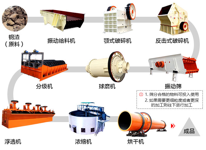 在振動(dòng)給料機(jī)的作用下,將堆積的鋼渣均勻、連續(xù)的送到顎式破碎機(jī)進(jìn)行粗碎加工,粗碎后的鋼渣通過(guò)振動(dòng)篩,合格的進(jìn)入反擊式破碎機(jī)或圓錐破碎機(jī)進(jìn)行中、細(xì)碎加工,不合格的返回上層繼續(xù)破碎,相同的經(jīng)反擊式破碎機(jī)或圓錐破碎機(jī)破碎后的鋼渣合格的通過(guò)輸送機(jī)輸出,即為成品,不合格的返回繼續(xù)破碎加工。